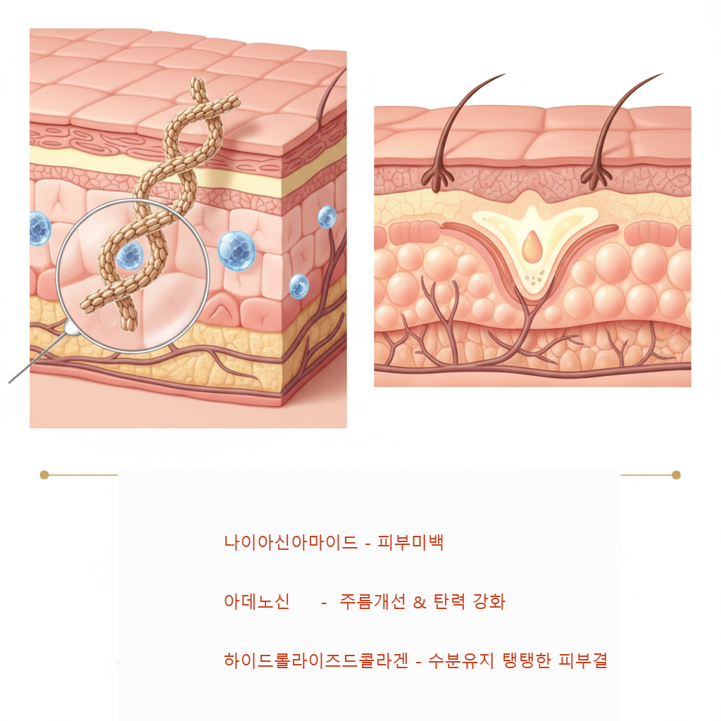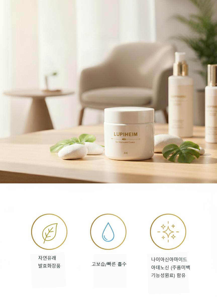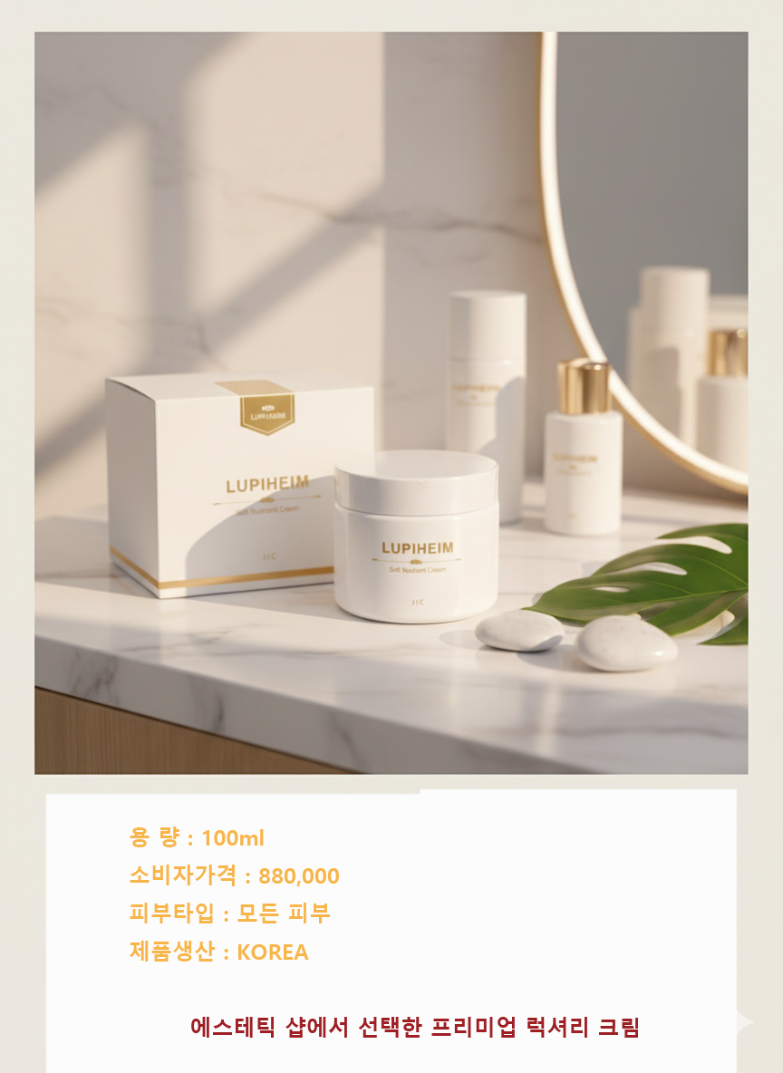 | 전성분 | 정제수, 부틸렌글라이콜, 세테아릴알코올, 세틸에칠헥사노에이트, 글리세린, 프로필렌글라이콜, 비즈왁스, 올리브오일, 카프릴/카프릭트리글리세라이드, 알부틴, 소듐하이알루로네이트, 베타-글루칸, 베타인, 호호바오일, 폴리소르베이트60, 사이클로펜타실록산, 사이클로헥사실록산, 피이지-100스테아레이트, 글리세릴스테아레이트, 소르비탄세스퀴올리에이트, 포도씨오일, 다이메티콘, 흰들버섯추출물, 소르비탄스테아레이트, 초피나무열매추출물, 할미꽃추출물, 우스니아추출물, 효모/셀레늄발효물, 카보머, 토코페릴아세테이트, 알란토인, 해바라기씨오일, 낫토검, 인도유향추출물, 효모/겨우살이발효추출물, 효모/모근발효추출물, 락토바실러스/콩발효추출물, 은행잎추출물, 금사연둥지추출물, 상황버섯추출물, 하이드롤라이즈드콜라겐, 아데노신, 디메칠설폰, 알지닌, 디소듐이디티에이, 향료. INGREDIENTS : Water, Butylene Glycol, Cetearyl alcohol, Cetyl Ethylhexanoate, Glycerin, Propylene Glycol, Beeswax, Olea Europaea (Olive) Fruit Oil, Caprylic / Capric triglyceride, Arbutin, Sodium Hyaluronate, Beta-Glucan, Betaine, Simmondsia Chinensis (Jojoba) Seed Oil, Polysorbate 60, Cyclopentasiloxan, Cyclohexasiloxan, PEG-100 Stearate, Glyceryl Stearate, Sorbitan Sesquioleate, Vitis Vinifera (Grape) Seed oil, Dimethicone, Agaricus Blaxei Extract, Sorbitan stearate, Zanthoxylum Piperitum Fruit Extract, Pulsatilla Koreana Extract, Usnea Barbata(Lichen) Root Extract, Saccharomyces/Selenium Ferment, Cabomer, Tocopheryl acetate, Allantoin, Helianthus Annuus (Sunflower) Seed Oil, Natto Gum, Boswellia Serrata Extract, Saccharomyces/Viscum Album (Mistletoe) Ferment Extract, Saccharomyces/Imperata Cylindrica Root Ferment Extract, Lactobacillus/Soybean Ferment Extract, Ginkgo Biloba Leaf Extract, Swiftlet Nest Extract, Phellinus Linteus Extract, hydrolyzed Collagen, Adenosine, Dimethyl Sulfone, Arginine, Disodium EDTA, Fragrance. |
