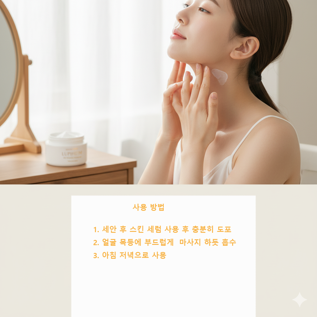 | 사용방법 | 기초 손질 마지막 단계에 적당량을 사용하여 볼, 턱, 이마, 코 순으로 골고루 스며들도록 부드럽게 펴 발라줍니다. |